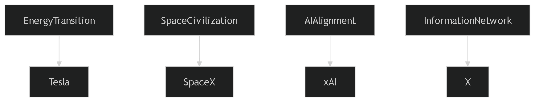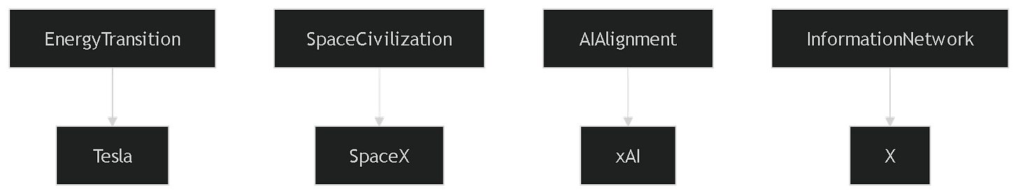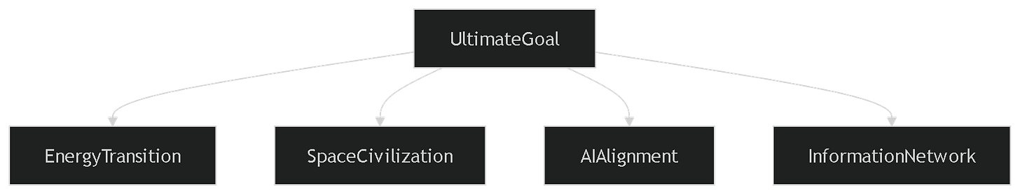 His stated ultimate goal is the long-term survival and flourishing of humanity. That goal is not implemented through a single organization. Instead, it is decomposed into multiple problem domains.